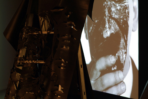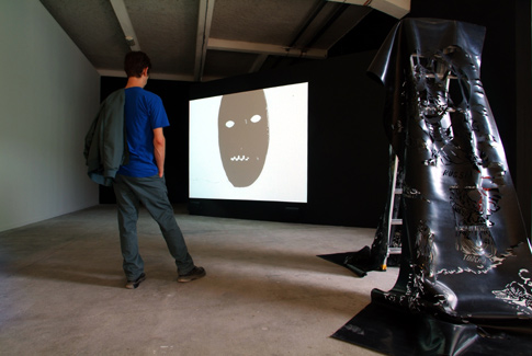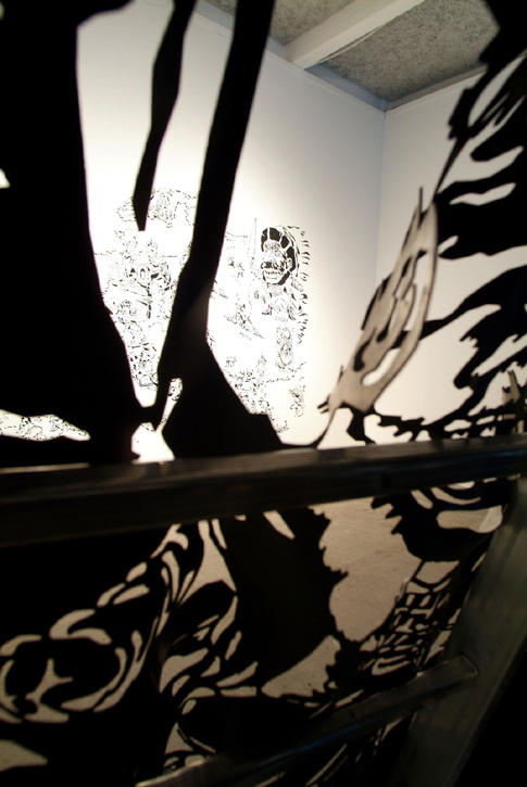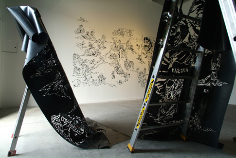 installation: silicon drawing on the wall, video projection, sound, rubber stencil on ladder